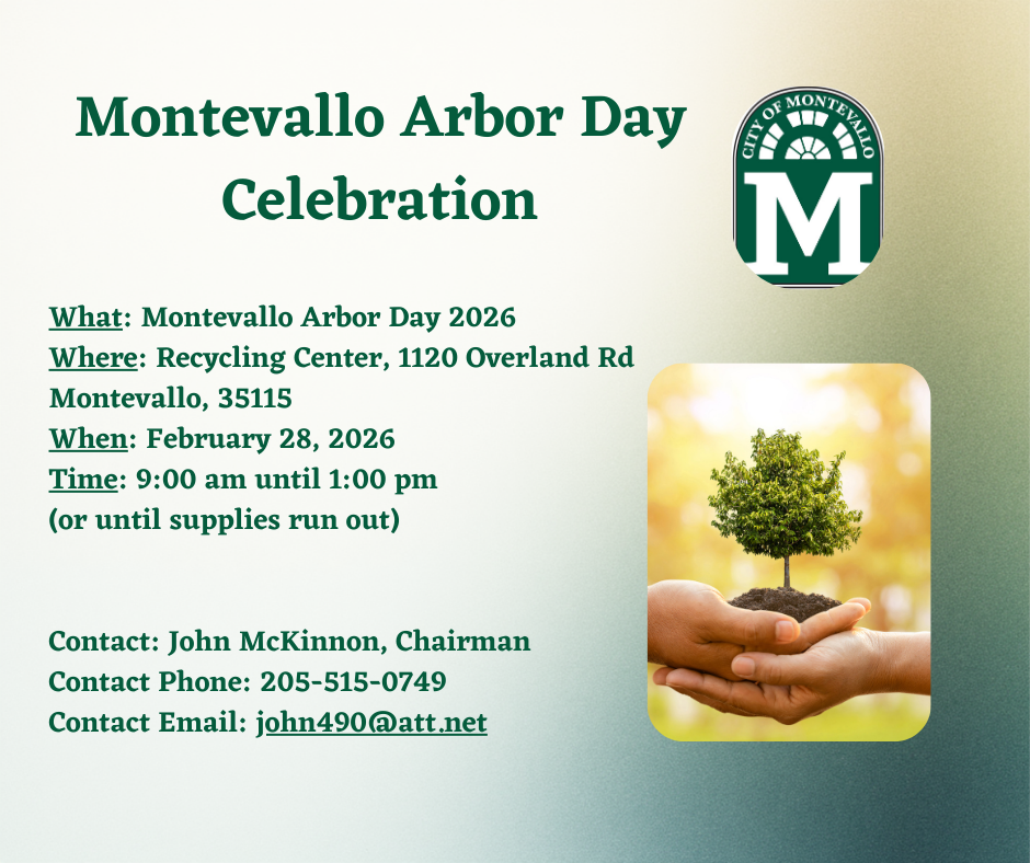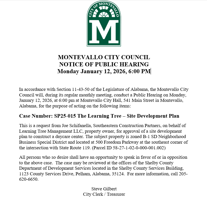 In accordance with Section 11-43-50 of the Legislature of Alabama, the Montevallo City Council will, during its regular monthly meeting, conduct a Public Hearing on Monday, January 12, 2026, at 6:00 pm at Montevallo City Hall, 541 Main Street in Montevallo, Alabama, for the purpose of acting on the following items: