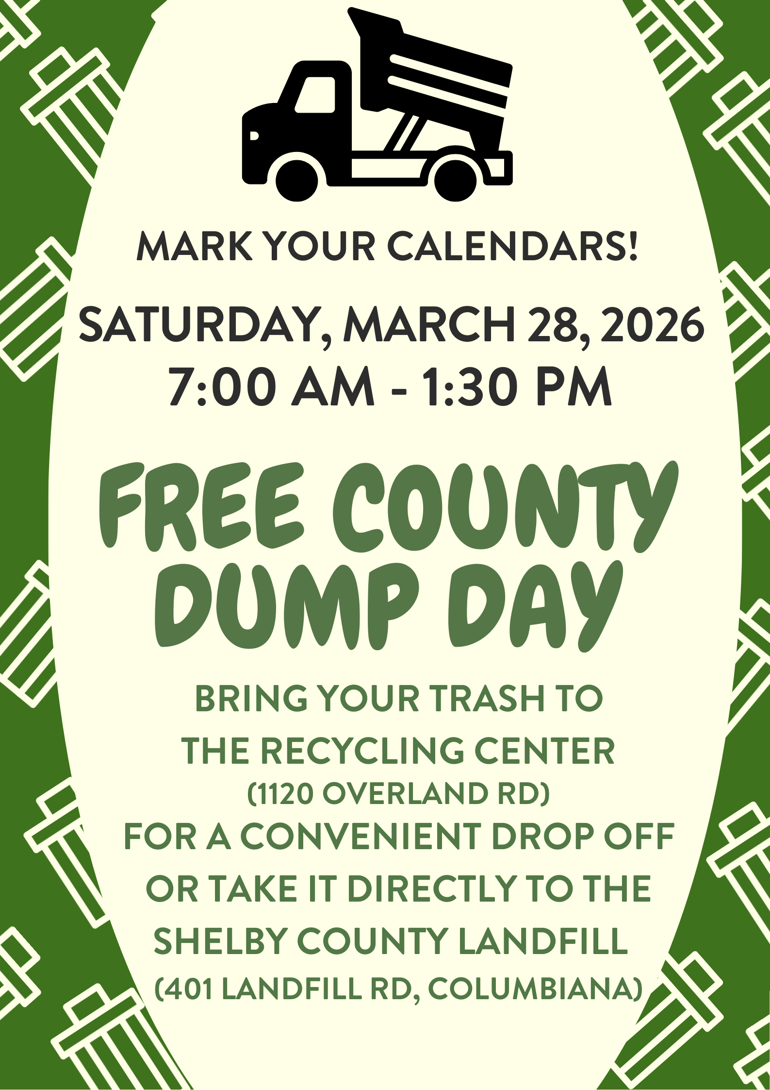 SAVE THE DATE: Saturday, March 28, 2026! The City of Montevallo will be participating in Shelby County Alabama's FREE Landfill Day for residents. Bring trash to Montevallo’s Recycling Center (1120 Overland Rd) from 7 am to 1:30 pm. *NOTE* Have your items to the Recycling Center by 1:30 pm so Public Works can get to the Landfill on TIME! Click here for "need to know" info.