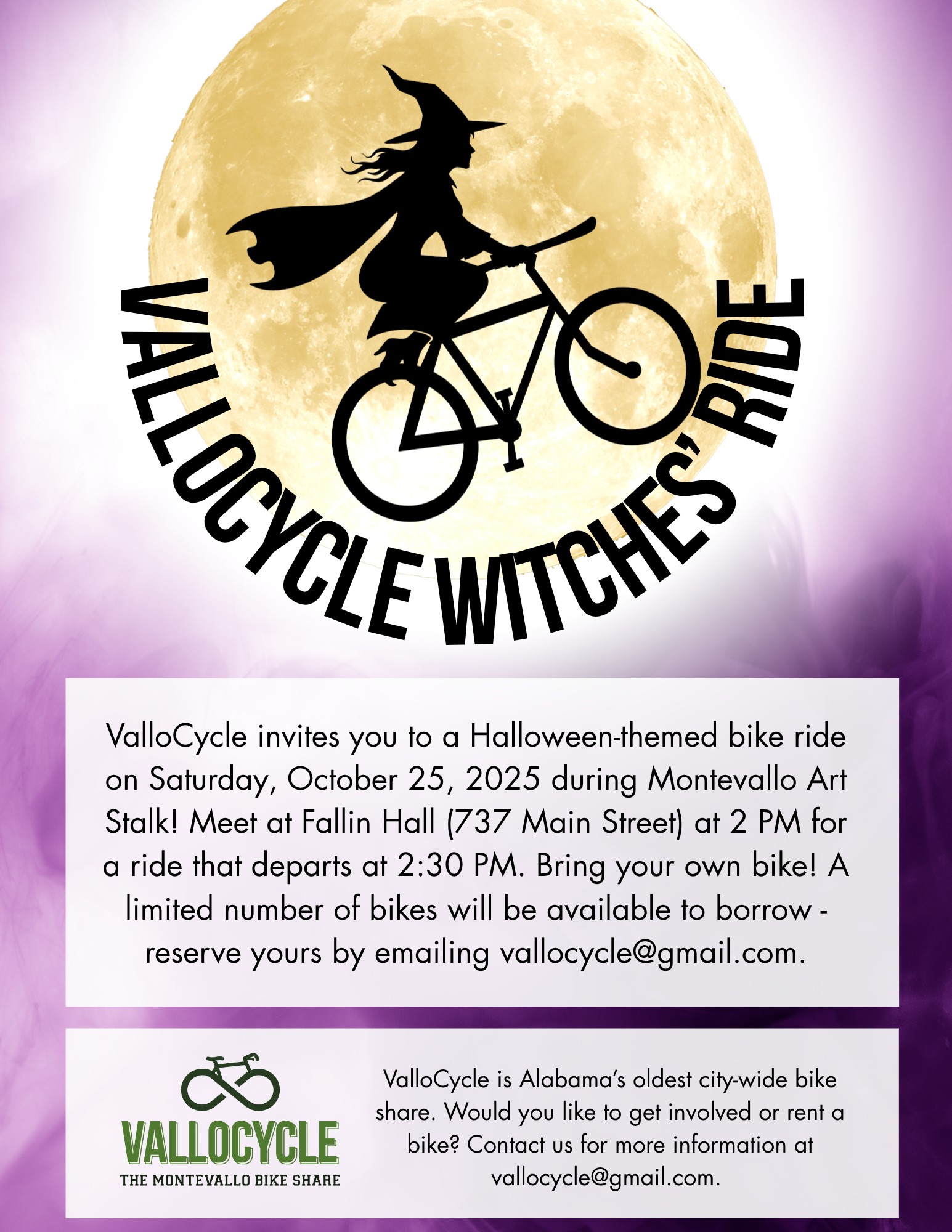 Grab your bikes and prepare to get spooky! ValloCycle is hosting a Witches' Ride during Montevallo Artwalk on Saturday, October 25!