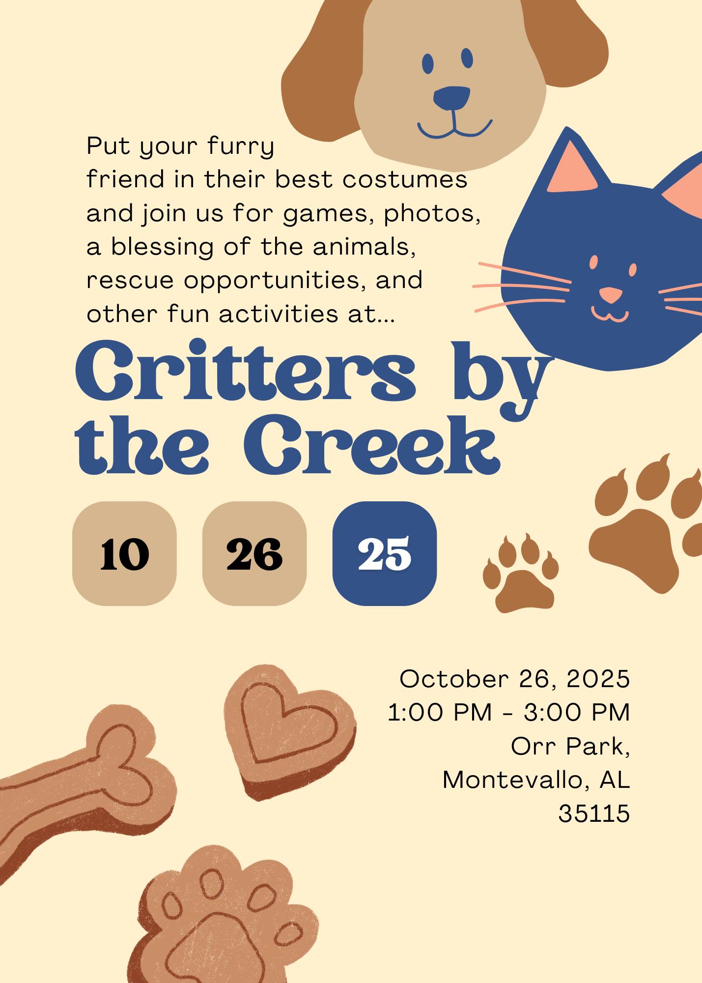 Critters by the Creek to be held on Sunday, October 26th, 1pm - 3pm in Orr Park. This event is organized by the Montevallo Parks & Recreation Board.